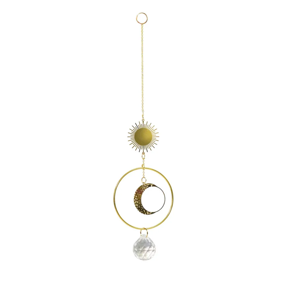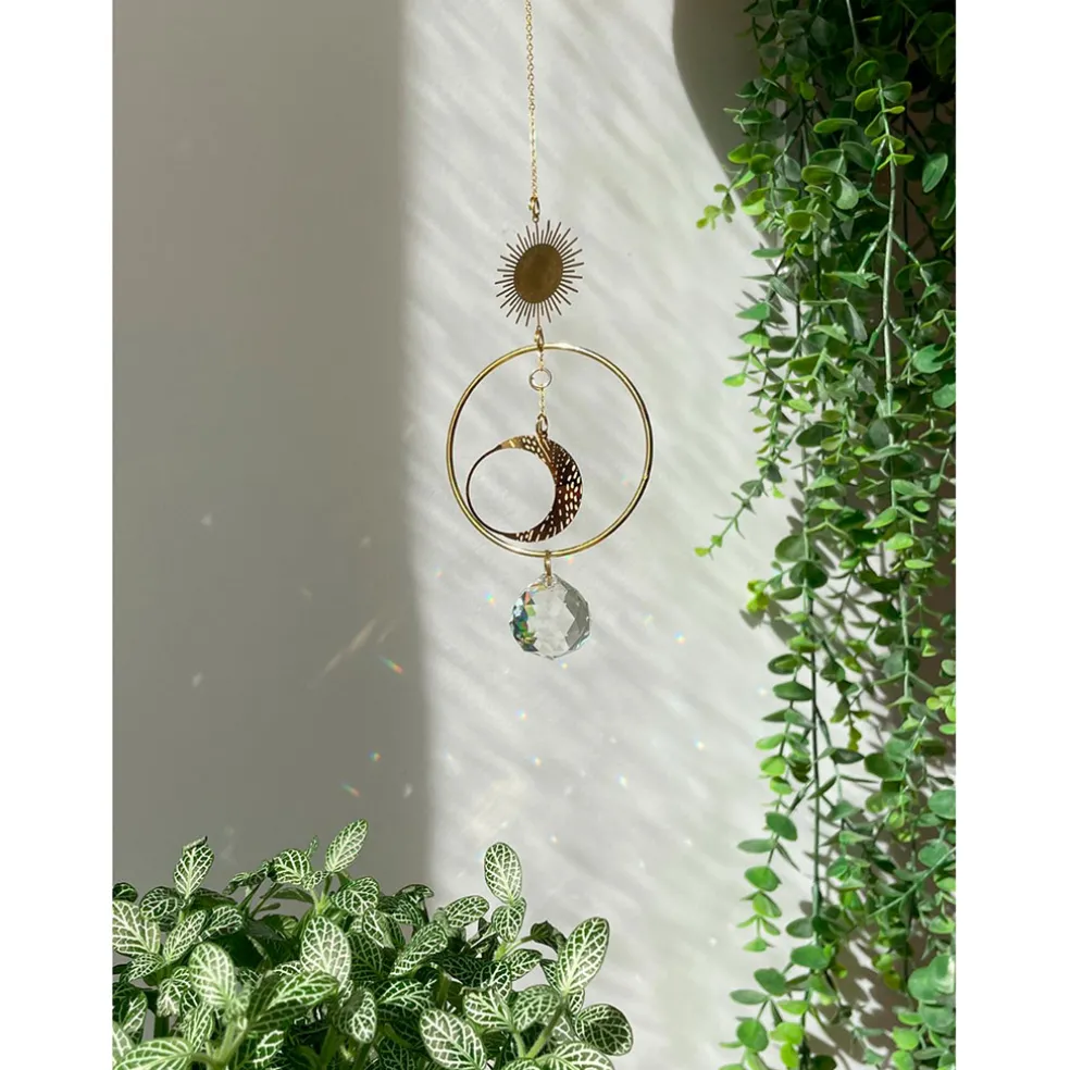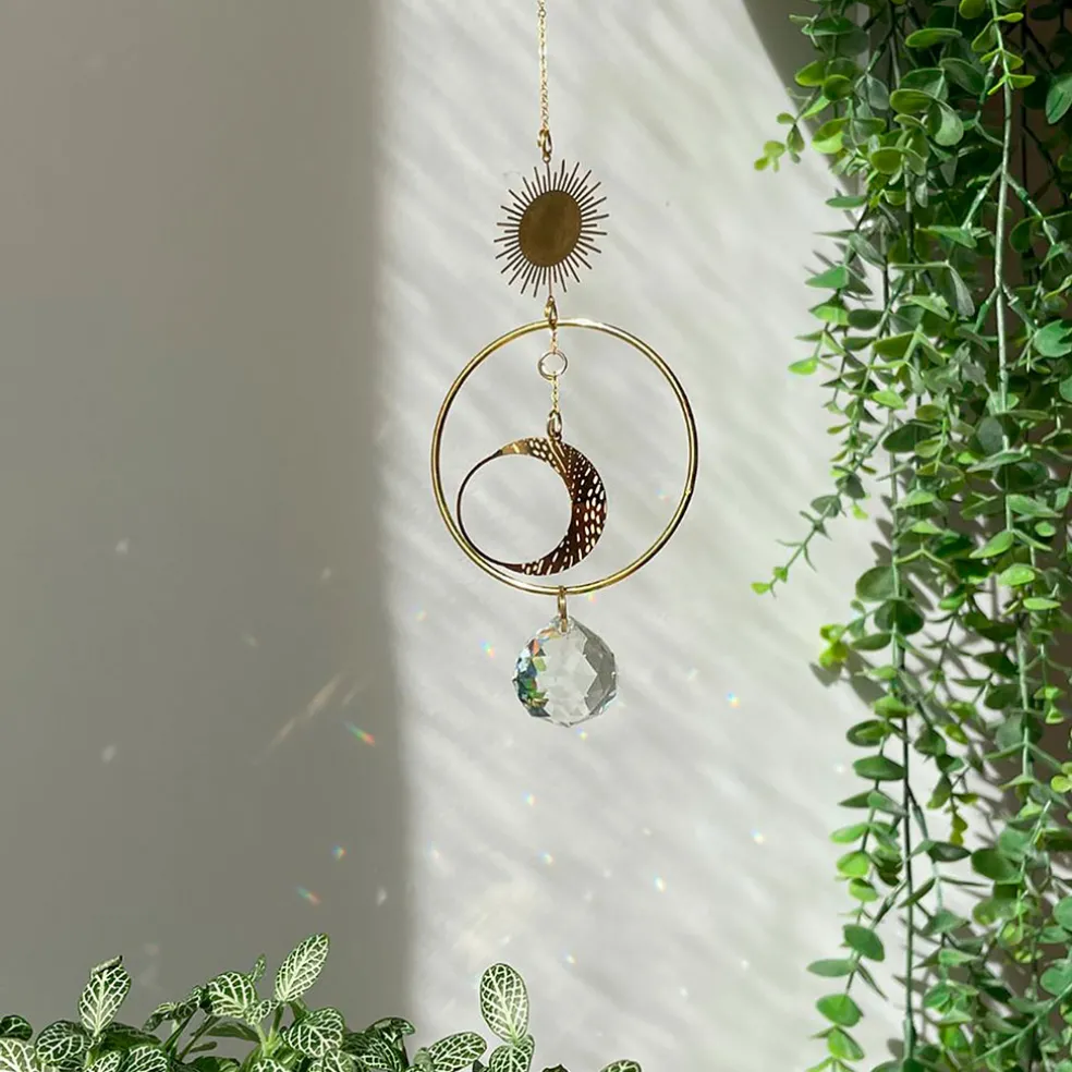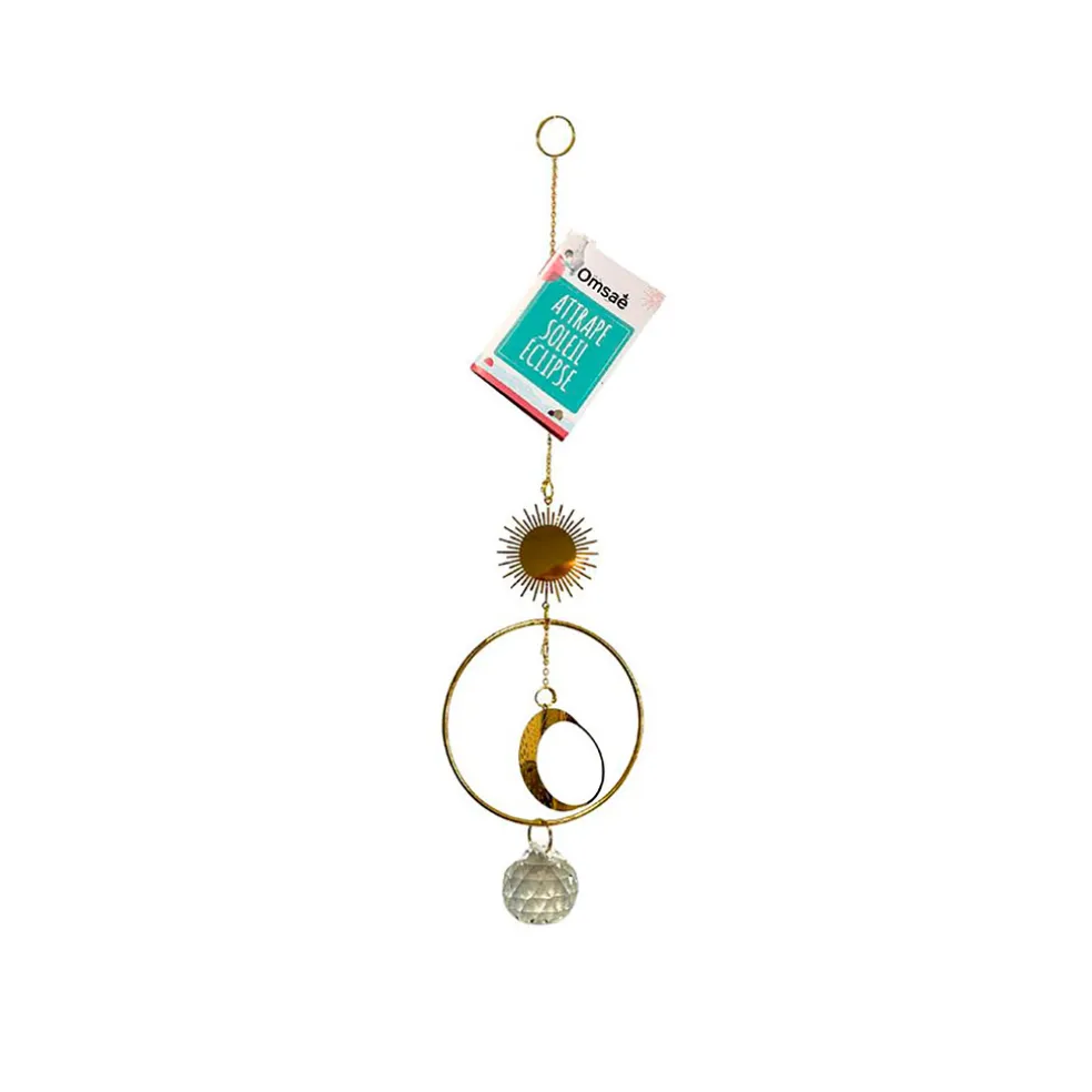 Rehaussez votre quotidien en laissant la magie lumineuse opérer et profitez de la douceur d’une évasion ensoleillée toute l’année.attrape-soleil eclipse en laiton doré, acier inoxydable et cristal de verre facetté. Longueur totale d’environ 27 cm.