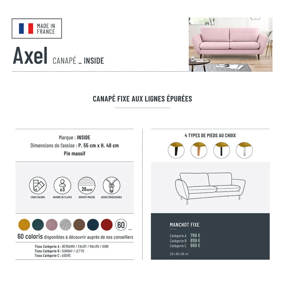 Le canapé fixe 3 places Axel vous séduira par son look simple mais très design. Il vous offrira une assise confortable et dynamisera votre salon. Il ne vous restera plus qu’à vous détendre. Convient à tous les espaces.