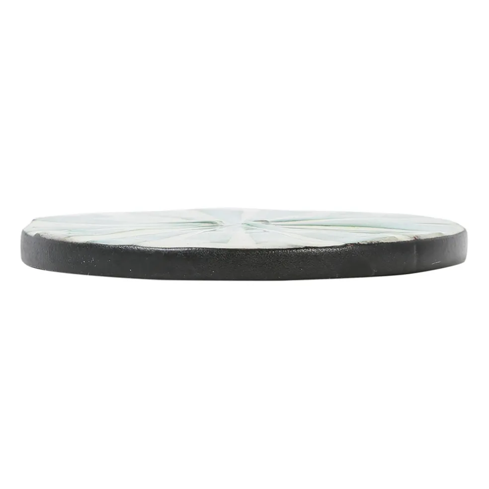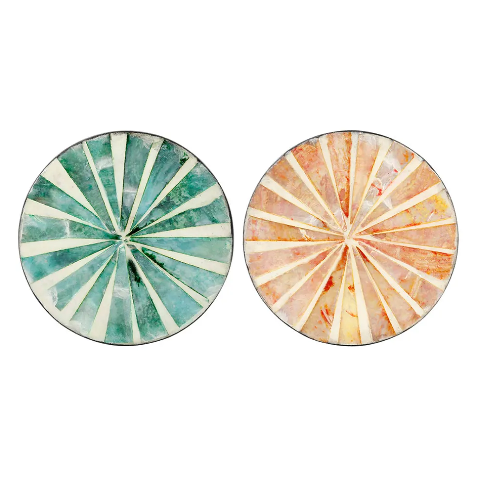 Venez découvrir nos Dessous verre x2 monarque vert et corail d9cm mdf et nacre de la marque Jardin d’Ulysse à découvrir sur Fabrique de Styles.CRÉATION UNIQUE