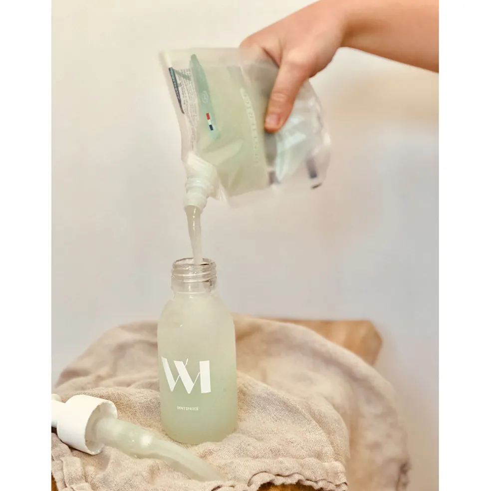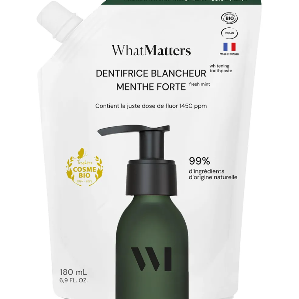 Développée avec des dentistes, sa formule suit les recommandations de l’union française pour la santé Bucco-dentaire et son flacon en verre renforcé® est 100% rechargeable.Papier, PP, PE-LD