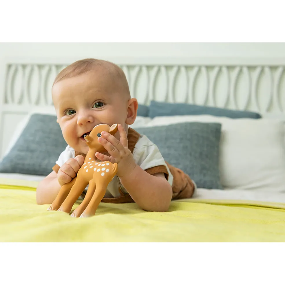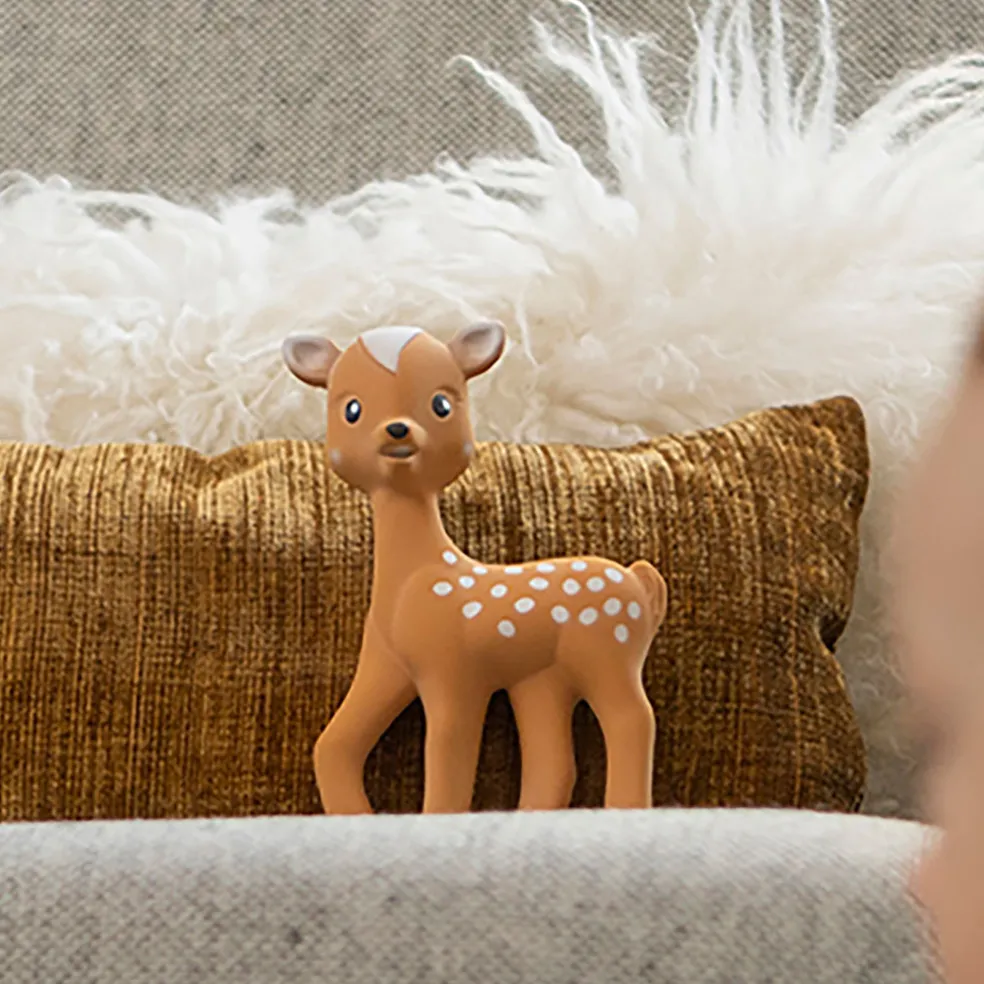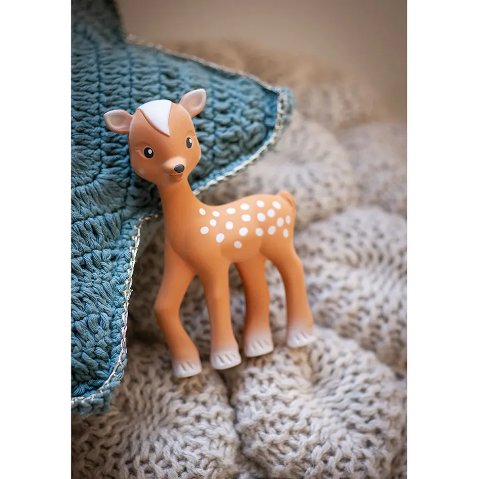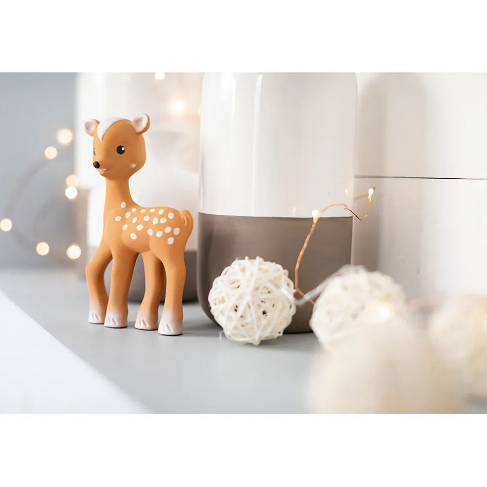 Composé de caoutchouc 100% naturel, Fanfan le faon est un jouet pour bébé qui offre une stimulation sensorielle complète.