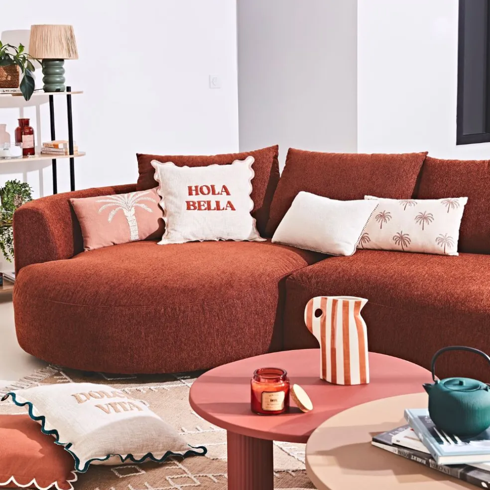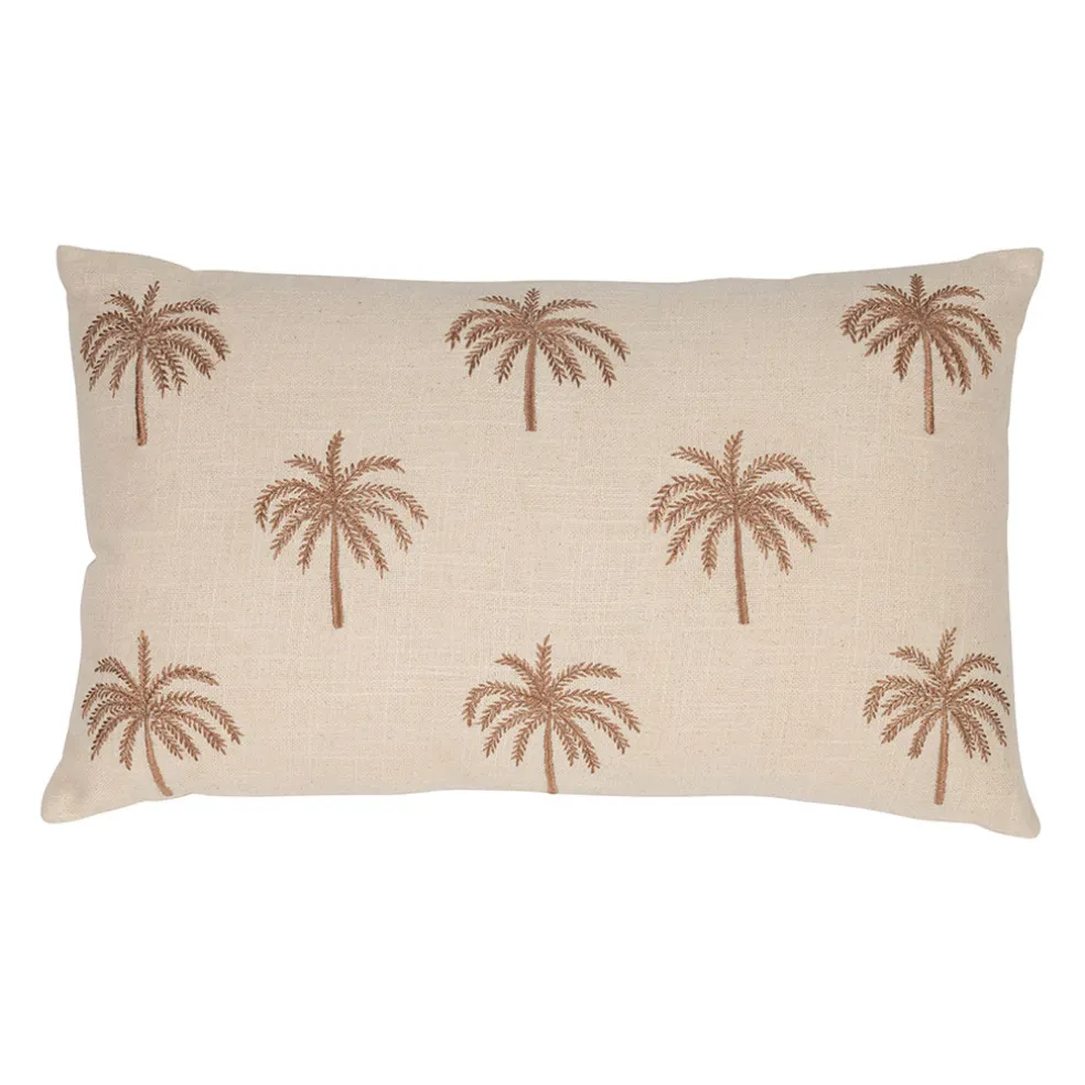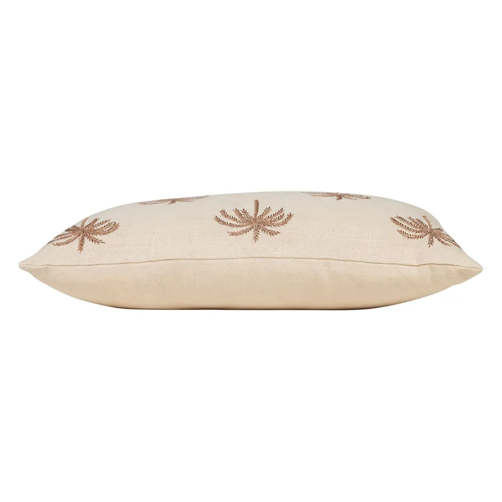Le coton écru, doux et naturel, s’accorde avec tous les styles de décoration, tandis que les palmiers brodés en fil marron ajoutent un joli contraste et du caractère.