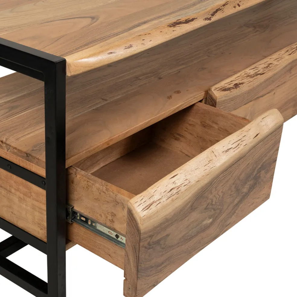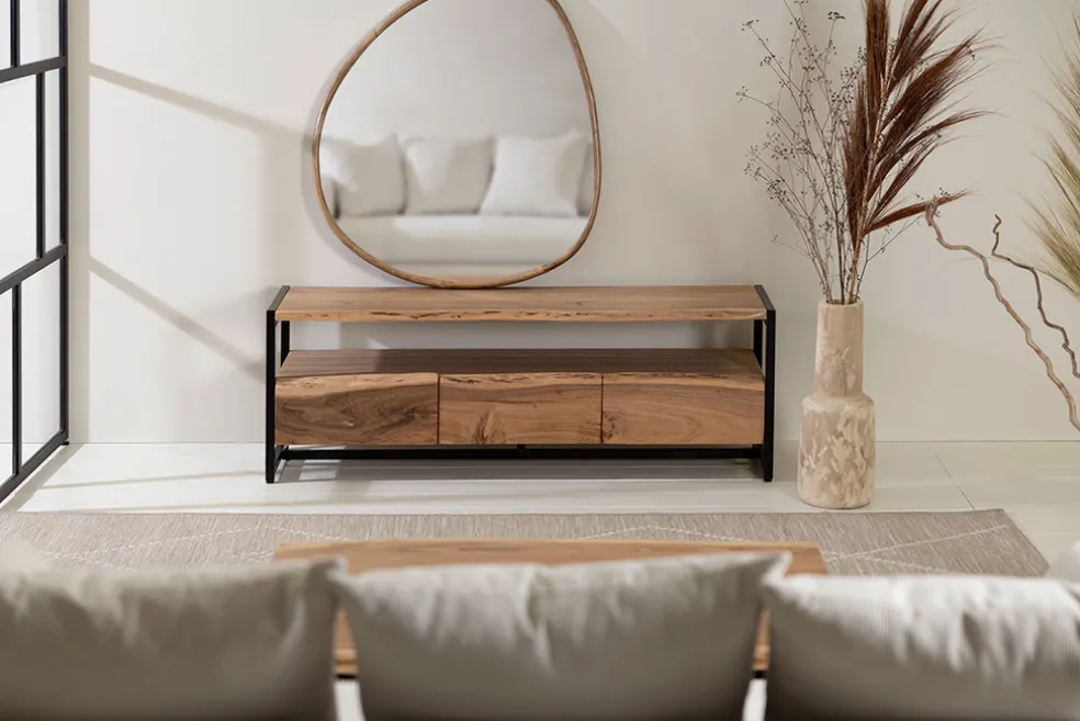 Découvrez le Meuble TV 3 portes en acacia et pieds en fer noir – Brooklyn, une pièce de mobilier moderne et tendance qui apportera une touche industrielle à votre espace de divertissement.