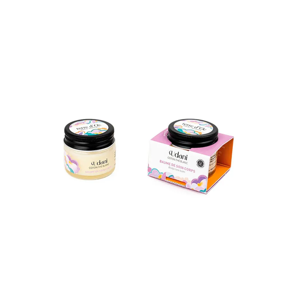 Ce mini baume bio Udani au parfum de coton et thé blanc offre un soin réconfortant dans un format compact.