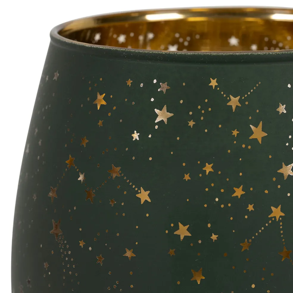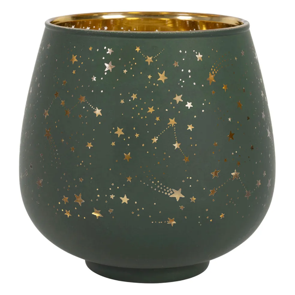 Apportez une touche de magie tropicale à votre intérieur avec ce magnifique photophore en verre vert et doré.
