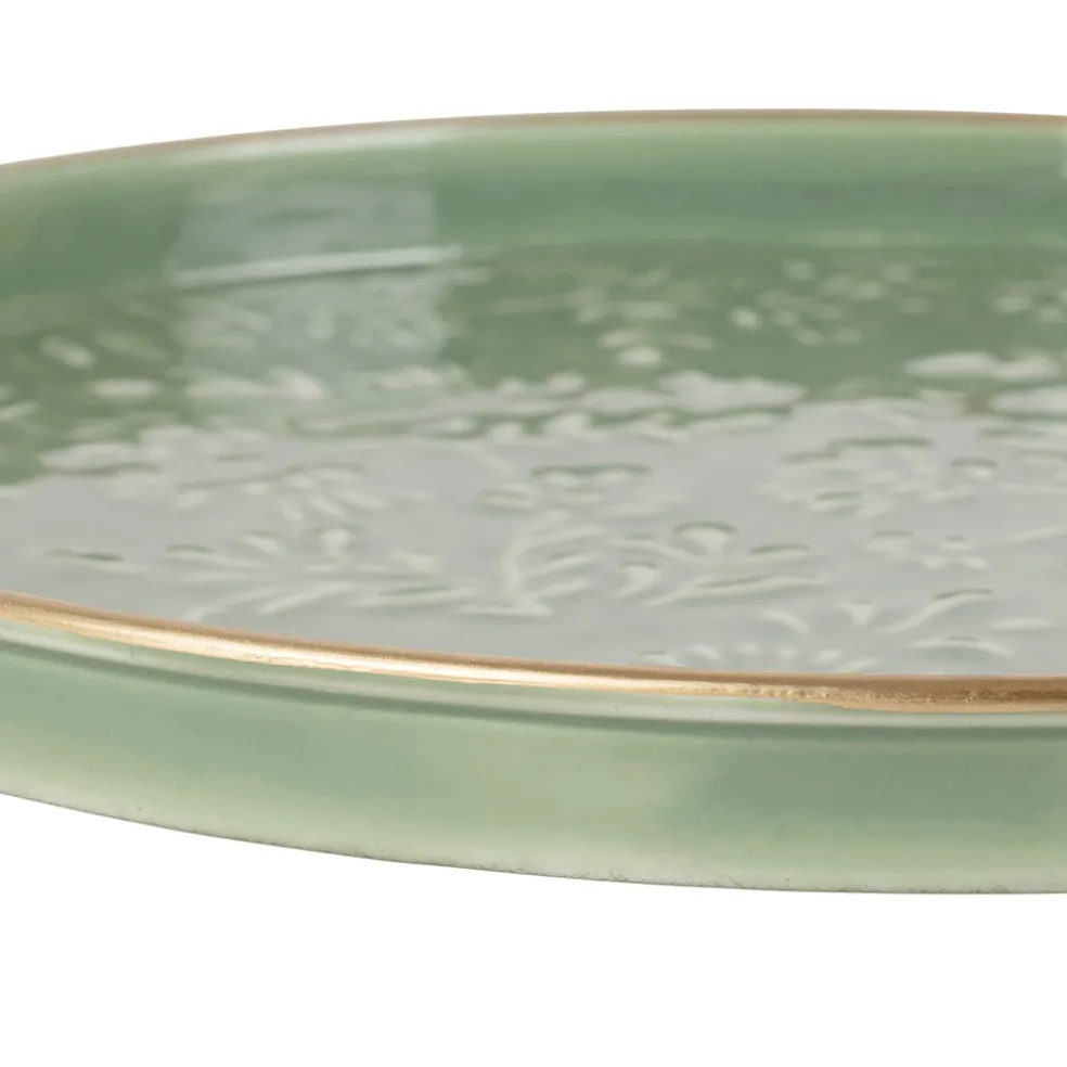 Découvrez un accessoire de choix qui ajoute du caractère à votre table : notre plateau rond en fer couleur sauge d’un diamètre de 36 cm.