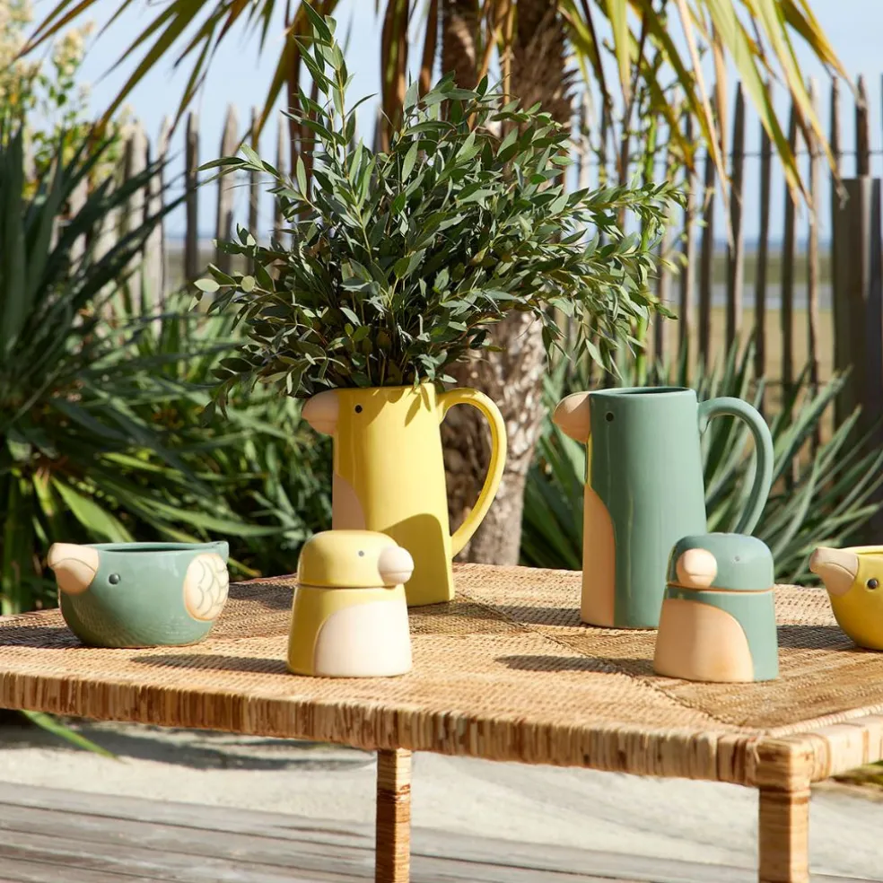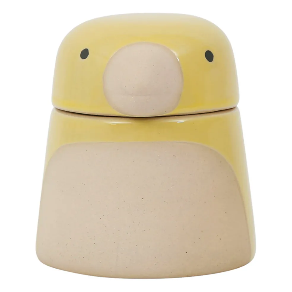 Découvrez notre superbe pot à oiseau avec couvercle en grès jaune – Calao, un véritable joyau pour votre table !