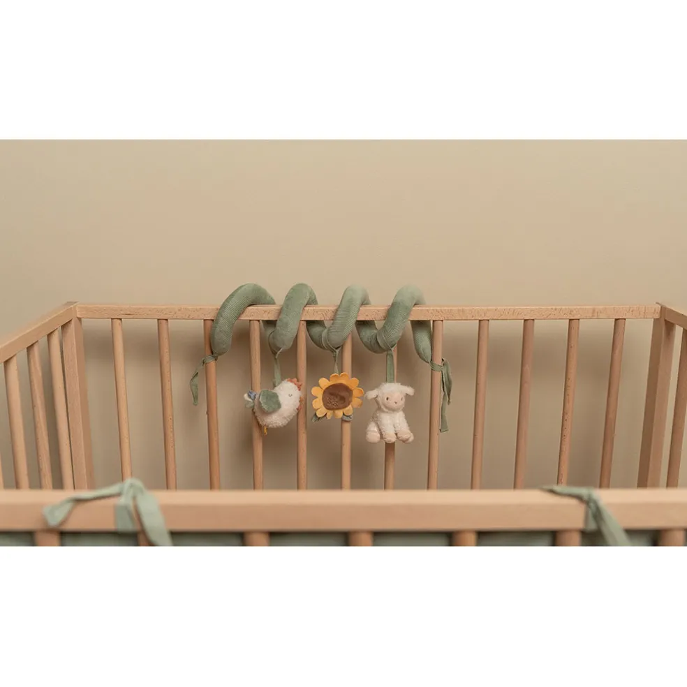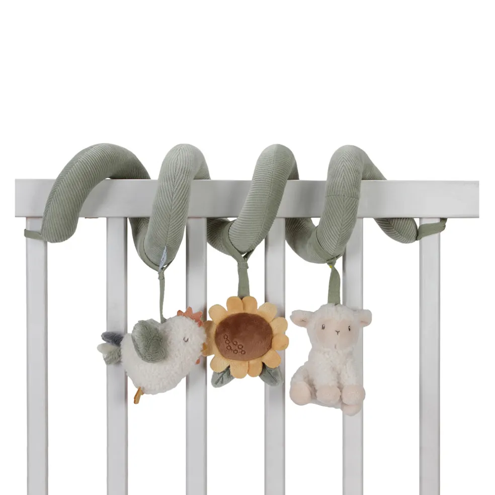 La spirale d’activités est en velours côtelé avec du coton et comporte un petit mouton, un poulet joyeux et une belle tournesol.