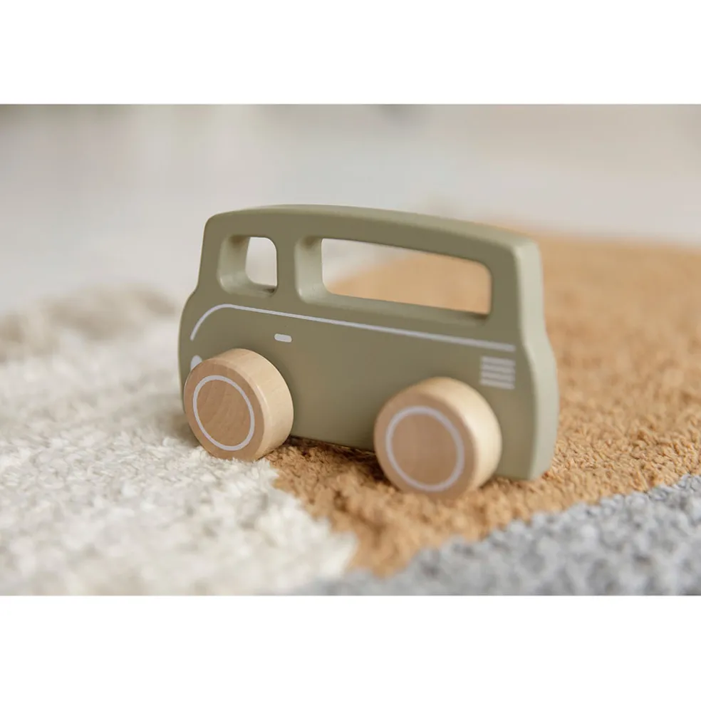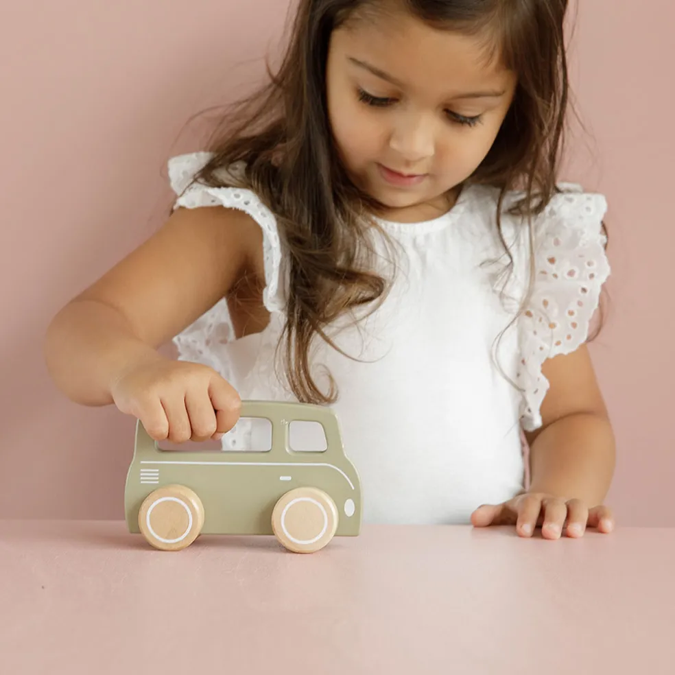 Avec son design intemporel et sa finition soignée, le van en bois couleur olive est parfait pour les aventures imaginaires et les jeux de rôle.