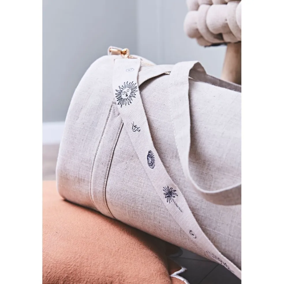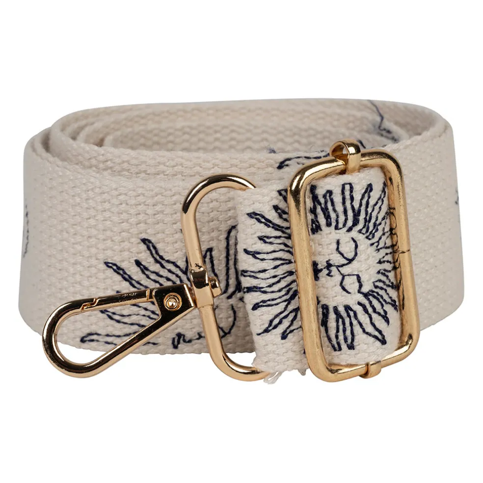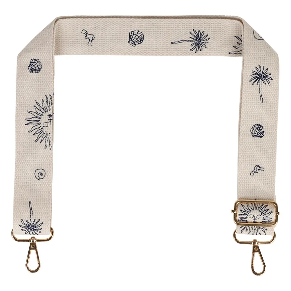 Transformez votre sac préféré en une véritable pièce unique avec cette bandoulière brodée, offrant une touche de couleur écru et bleu.