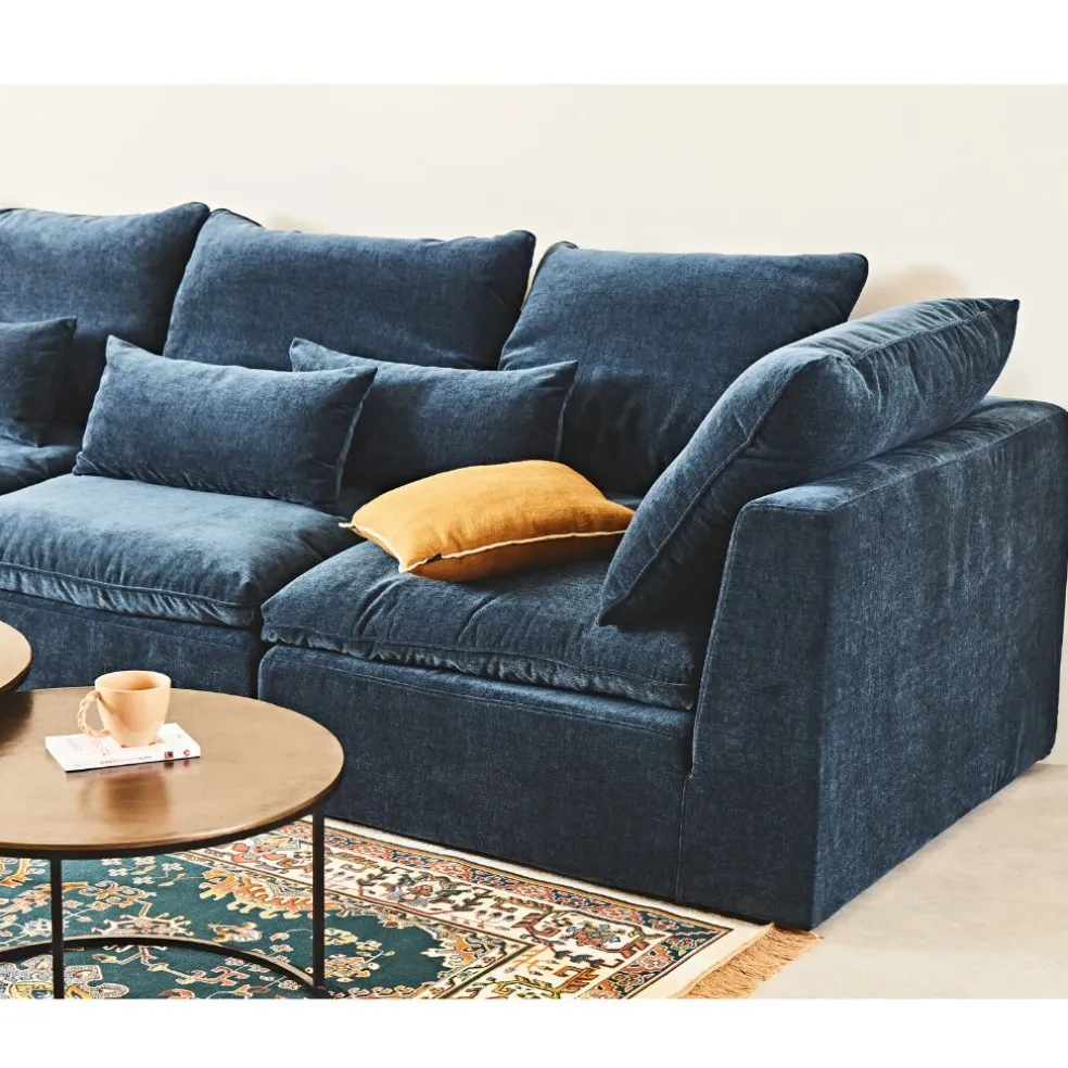 Le canapé est composé de 4 modules : 1 chauffeuse, 2 pièces d’angles et 1 pouf.Structure : La structure du canapé « Auguste » est principalement composée de panneau de particules, qui est un matériau composite utilisé couramment dans la fabrication de meubles, et de pin massif, qui est du bois massif de pin.