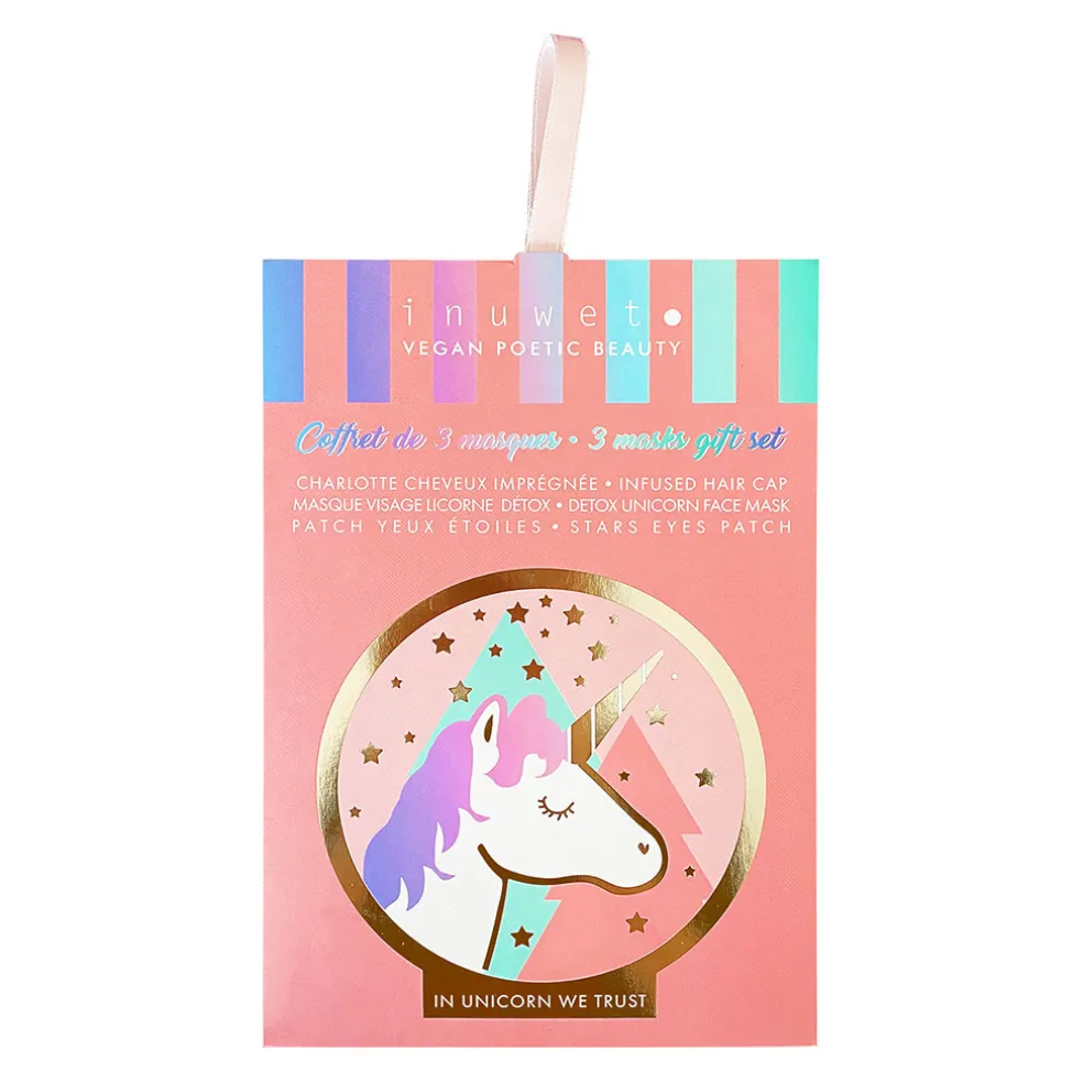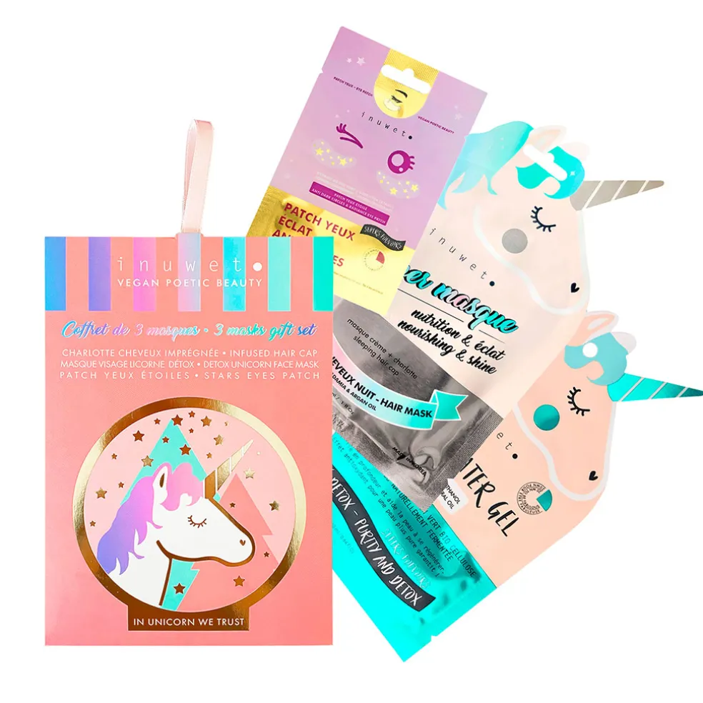 Ce set contient trois indispensables : un masque cheveux nourrissant, un masque visage licorne détoxifiant et des patchs yeux en forme d’étoiles pour un regard frais et reposé.