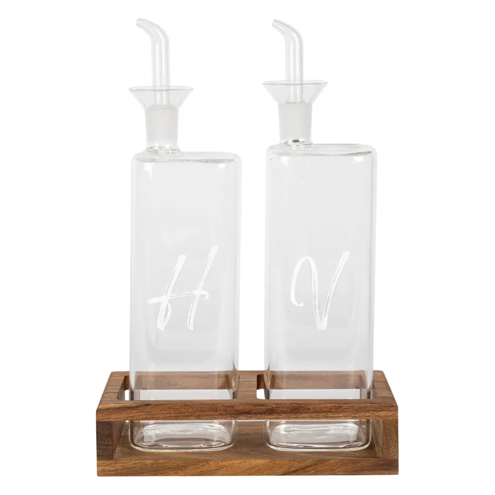 Cet ensemble élégant, au design épuré, apporte une esthétique moderne et fonctionnelle à votre espace culinaire, offrant une manière chic de présenter et d’utiliser vos huiles et vinaigres préférés.Verre borosilicate et acacia.