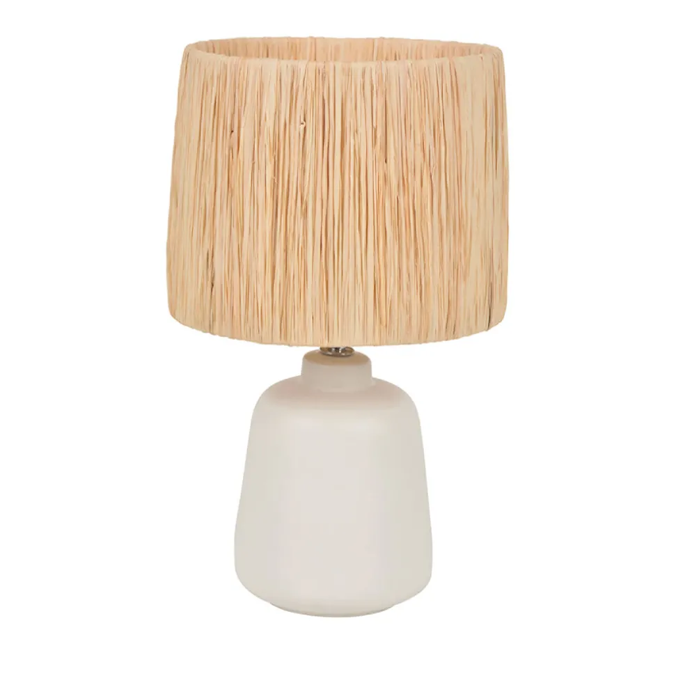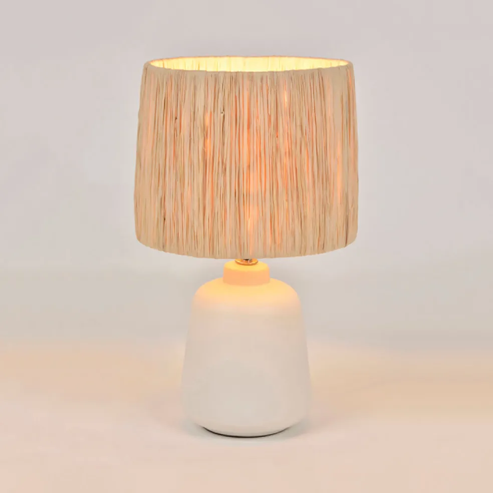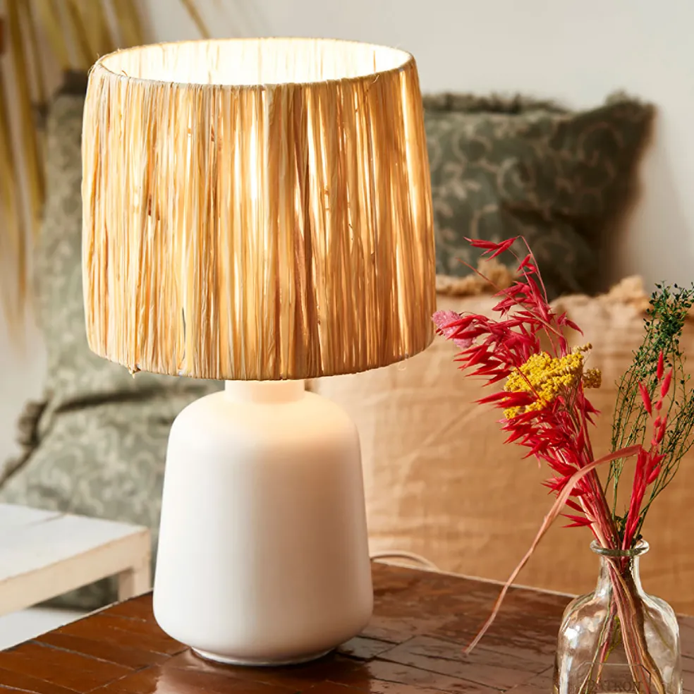 La lampe Paros, avec son pied arrondi en céramique blanche et son abat-jour cylindrique en raphia, offre une touche de douceur et de naturel à tout intérieur.