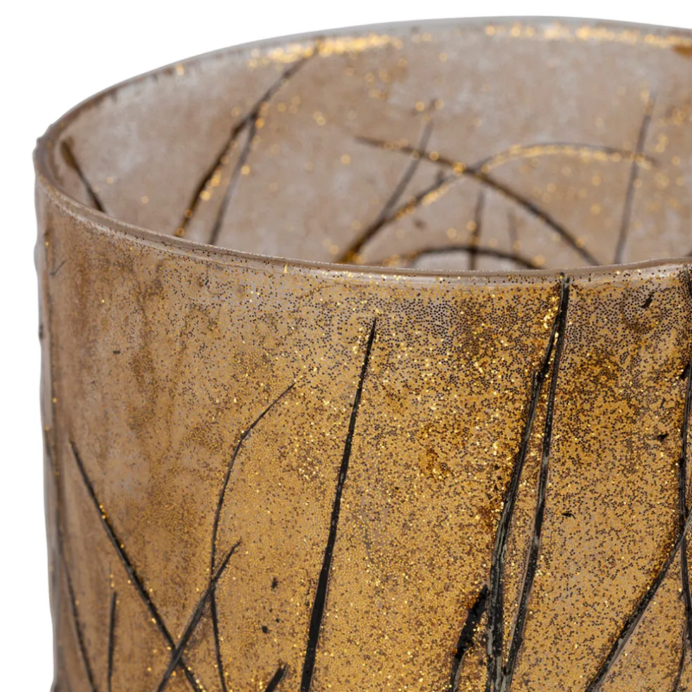 Illuminez votre espace avec notre photophore en verre de 10 cm, magnifiquement agrémenté de détails végétaux dorés et noirs.