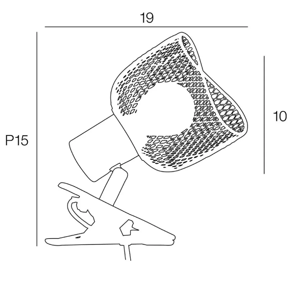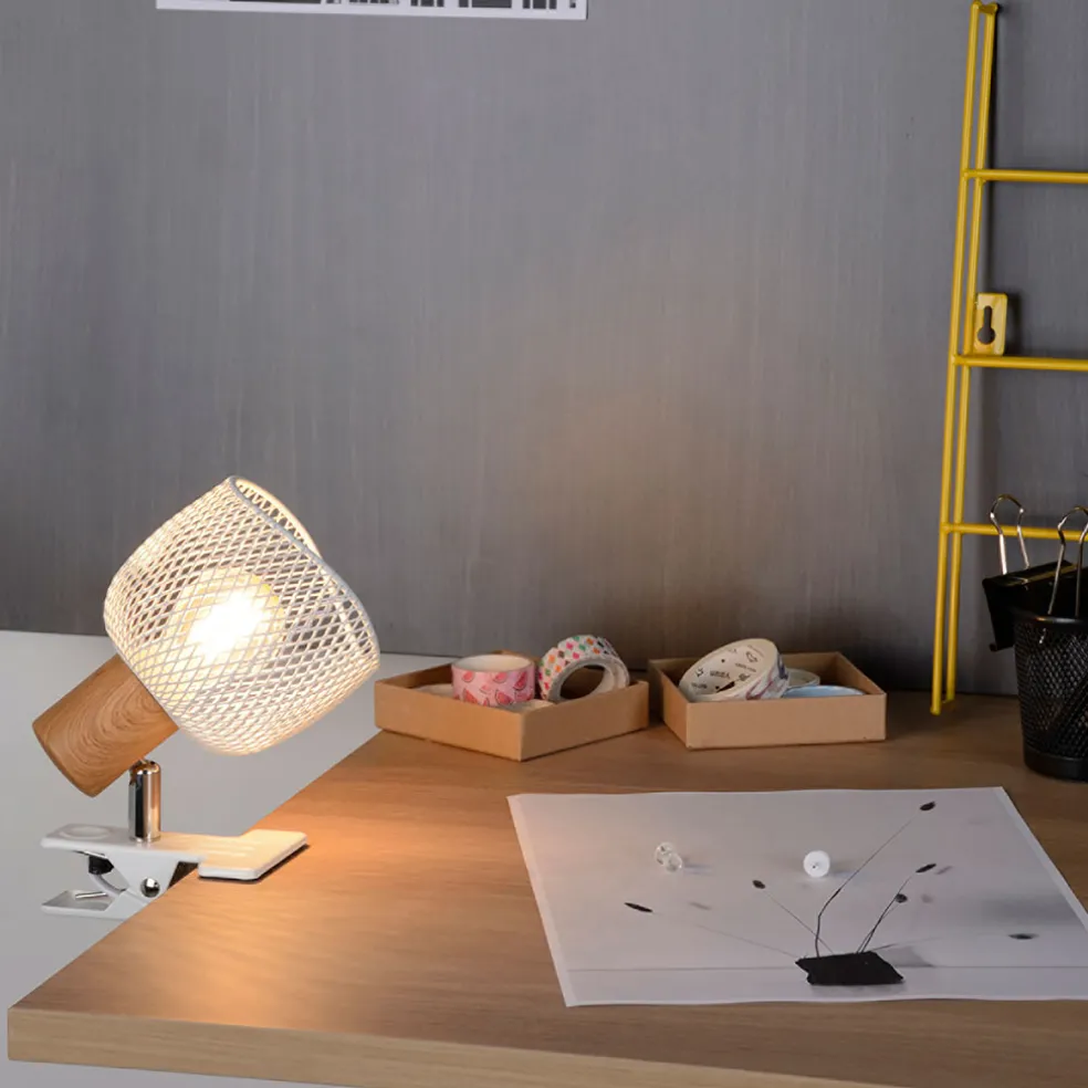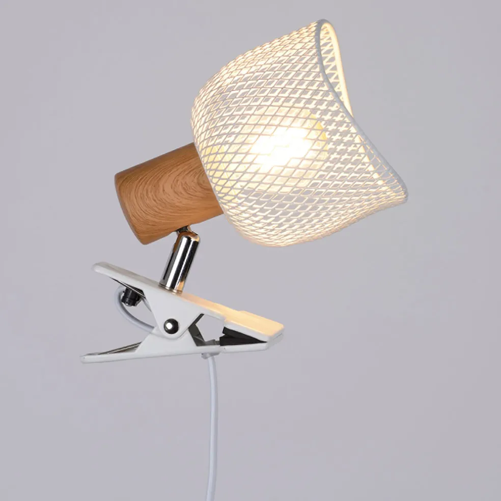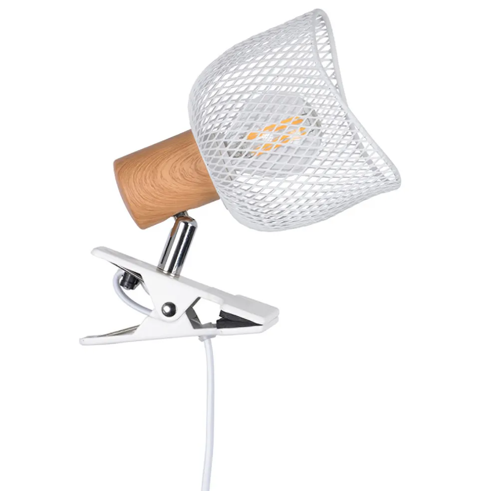 Spot à pince base métal avec abat-jour en métal grillagé peint et finition effet bois. Tête articulée et pince en plastique. Coloris : blanc. IP20. H19cm-L10cm-P15cm. Classe 2. E14-25W.métal