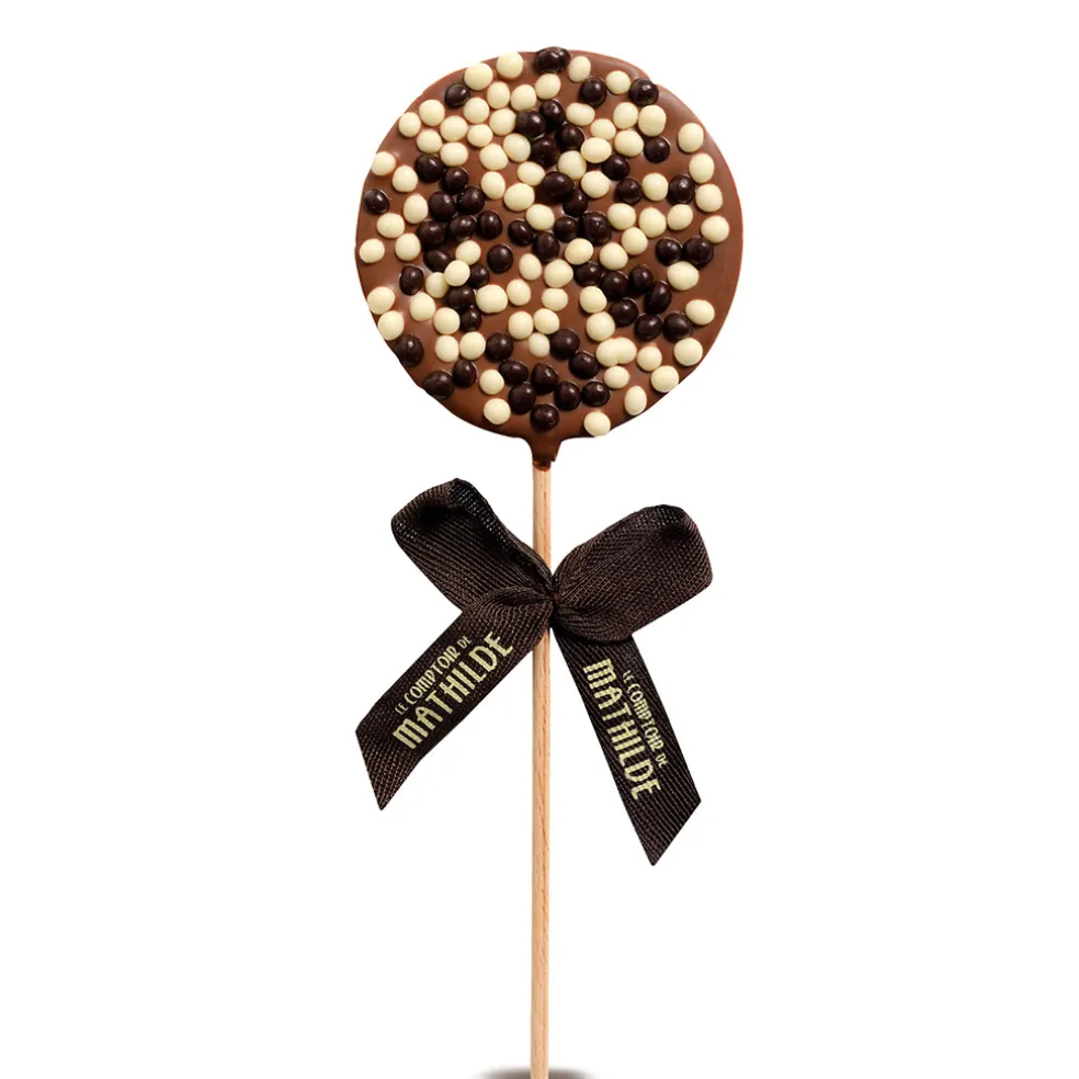 Découvrez la gourmandise ultime qui transforme chaque pause en un pur moment de plaisir : la délicieuse sucette en chocolat au lait parsemée de riz soufflé.