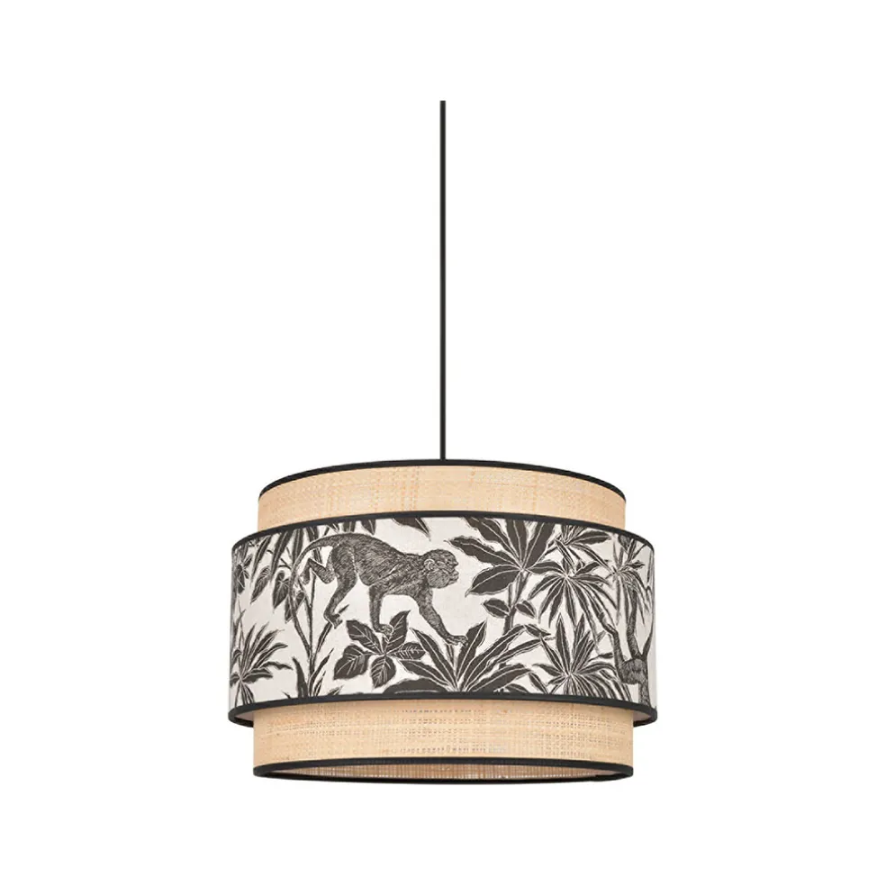 Suspension double cylindre bi-matière en coton imprimé et raphia.