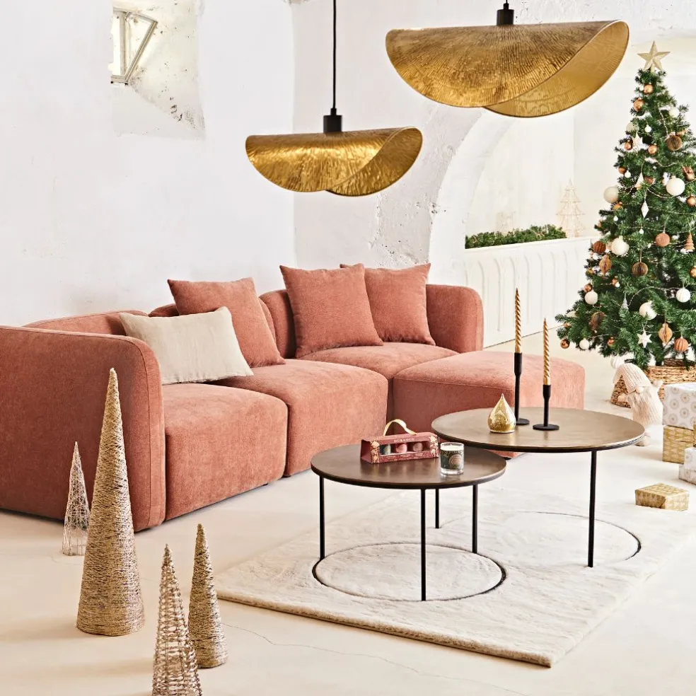 Le design en métal doré ajoute une dimension moderne et chaleureuse, capturant la lumière d’une manière qui crée des reflets agréables et subtils.