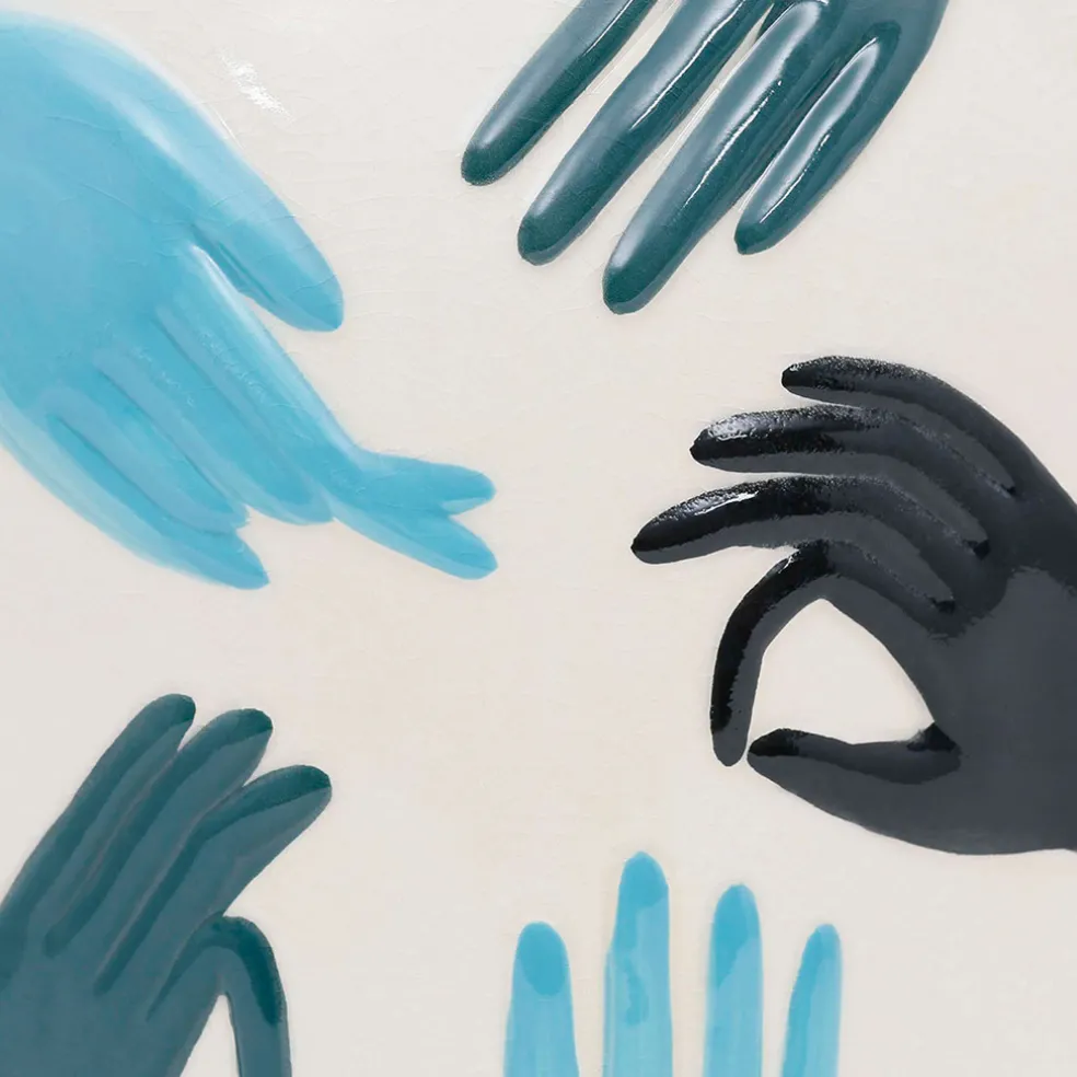 Ce vase en porcelaine arbore une audacieuse teinte bleue et se distingue par son design original illustrant une main et un visage.
