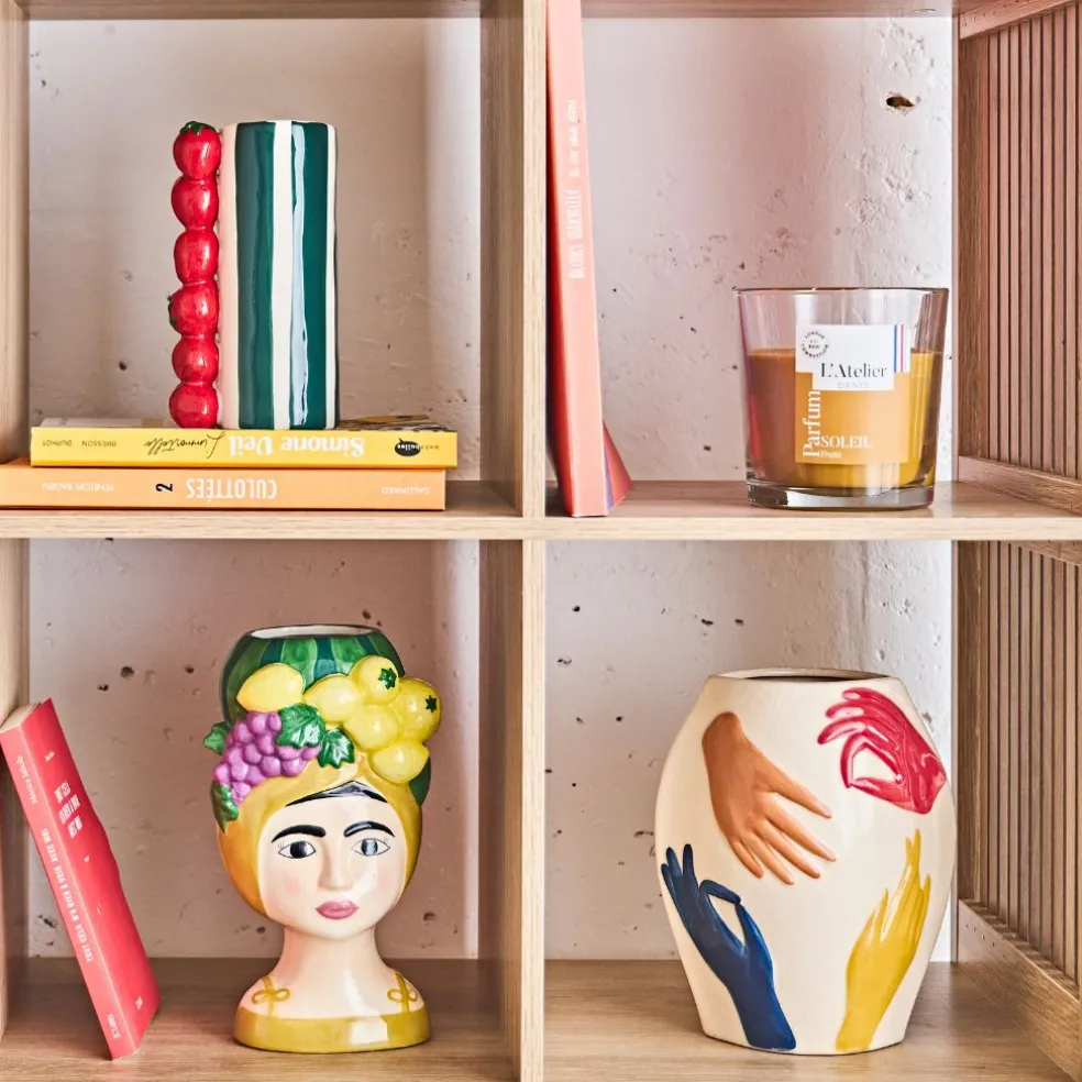 Découvrez le charme irrésistible de notre vase multicolore en forme de main tenant un visage, une véritable œuvre d’art qui apportera une touche artistique à votre intérieur.